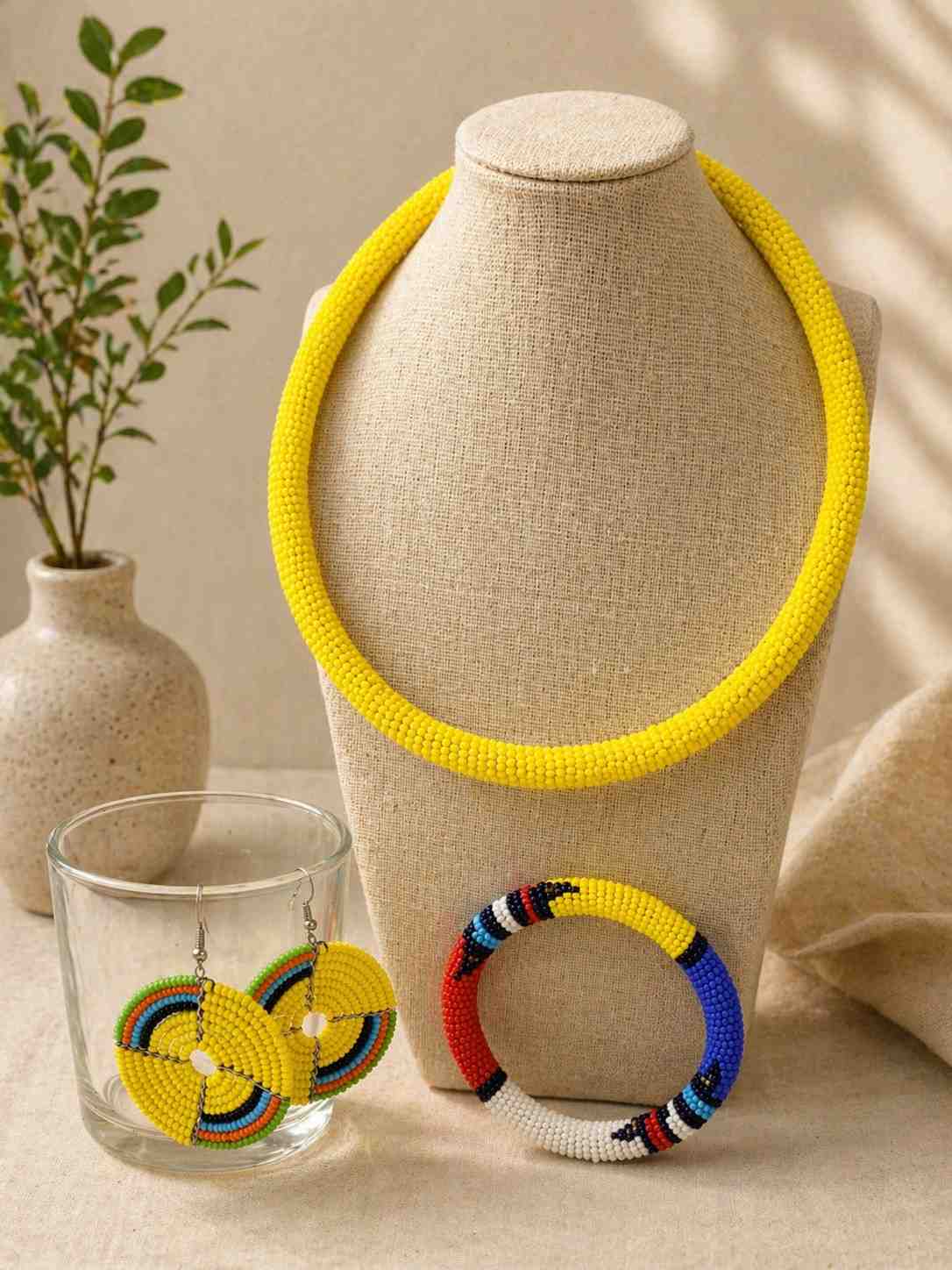 Make a statement with this vibrant Maasai-inspired beaded jewelry set, featuring a striking choker necklace, matching bracelet, and handcrafted earrings. Designed with bold yellow tones accented by multicolor beadwork, this set beautifully reflects the richness and artistry of African heritage.